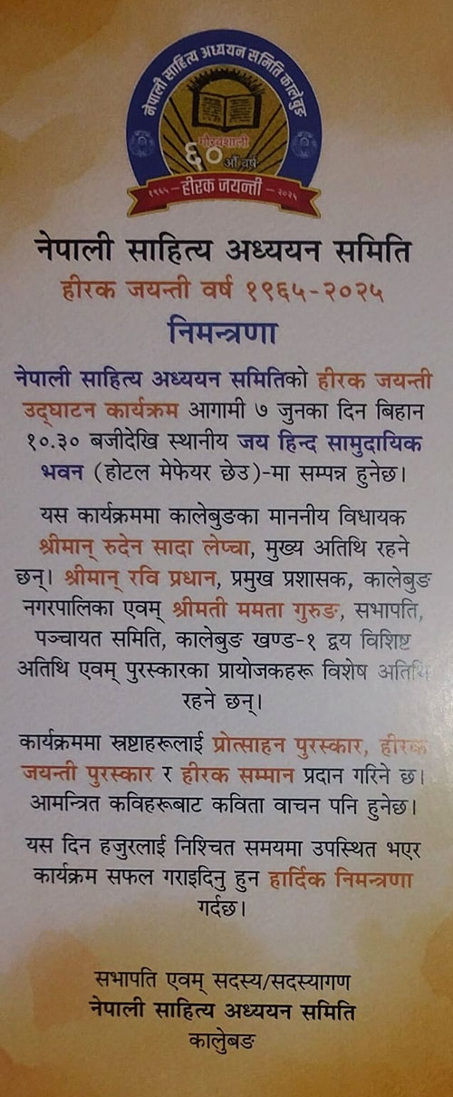 सन् १९५० को प्रथम प्रहरतिर कालेबुङमा नेपाली भाषा, साहित्य र संस्कृतिको संरक्षण र अभिवृद्धि गर्न केही बौद्धिक जमात देखा परेको जान्न पाइन्छ। उक्त बौद्धिक जमात देखा पर्नुको प्रमुख कारण उनीहरूले भोगेका, अनुभव गरेका अनि देखेका समस्याहरूको समाधान थियो। त्यस समयका व्यक्तित्वहरूमा मोतीचन्द प्रधान, पदमलाल सुब्बा, रूपराम देवान, धनराज बराल, भानुभक्त लामिछाने, भाइचन्द प्रधान, नन्दकुमार कुमाई, हर्कसिंह छेत्री, लोकेशचन्द्र प्रधान, हरिभक्त नवपानीय, इन्द्रदेव सिंह, मङ्गलसिंह घिमिरे, खिदमद सुब्बा, दिलबहादुर प्रधान, गङ्गा पाखरिन आदि उल्लेखनीय रहेका भेटिन्छन्। साहित्यमा अभिरुचि भएका यी महानुभावहरूले व्यक्तिगत प्रयासमा कालेबुङमा साहित्यिक क्रियाकलापहरू गर्ने गर्थे। तर संस्थामार्फत भएको कुनै पनि साहित्यिक कार्य असल हुन्छ भन्ने श्रेष्ठ ध्येयले ती साहित्यानुरागी महानुभावहरूको सामूहिक प्रयासमा नेपाली साहित्य अध्ययन समितिको कालेबुङमा स्थापना भयो। यो थियो जुन ७, १९६५ को एउटा प्रशंसनीय कार्य।
